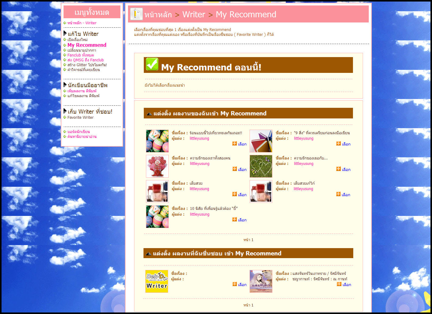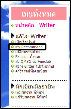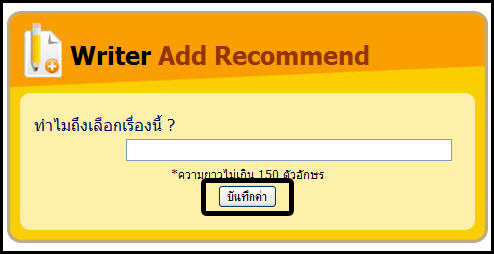 Writer: เปิดพื้นที่ แนะนำผลงานตัวเองเป็น My Recommend พื้นที่แนะนำผลงานต่างๆ ที่เราชื่นชอบให้เพื่อนๆ ชาว Dek-D.Com ได้รู้จักมากขึ้น โดยอาจจะเป็นผลงานของตัวเราเองหรือผลงานที่เราชอบที่สุดก็ได้ ขอเพียงเราชอบและอยากแนะนำเท่านั้นพอ 1 เข้า Control Panel กด "Writer" 2 เลื่อนลงมาจะเจอ "My Recommend" กด "เพิ่มเรื่อง" 3 เลือกผลงานที่ต้องการแนะนำ พร้อมทั้งใส่เหตุผลที่เลือก กด "บันทึกค่า" ตอนต่อไป !พบกับ ระบบ "วิจารณ์ผลงาน" เพื่อนๆ แบบหรูเริ่ด