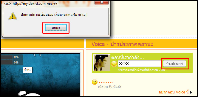 MyiD: iD Voice มันคืออะไรกันนะ " iD Voice " เนี่ย...มาดูๆๆ กันจ้ะ มาดูกันสิว่า " iD Voice " เนี่ยมีไว้ทำอะไร..??มาหาคำตอบกันที่นี่เลย..มาๆๆ ตามลงมาอ่านกันจ้ะ 1. มองๆๆ หา "iD Voice" กันดีกว่า.. อยู่ไหนเนี่ย อ้าว!! ไม่เห็นมีเขียนบอกเลยใช่ไหม 555 น้องๆ ลองมองที่ด้านบนของ My.iD ของเราหรือเพื่อนๆ ดูสิจ๊ะ.. แถบสีส้มๆ ที่มีหน้ายิ้มแป้น แล้นถัดมาเป็นช่องที่เขียนว่า "กำลัง..." ส่วนอีกช่องด้านขวาก็มีข้อความสั้นๆ ขึ้นสลับไปมา นี่แหละๆ คือ "iD Voice" 2. หาเจอแล้ว... อย่ารอช้า!! มาคลิกเลือกรูป emoticon ของ " iD Voice " กันเลยจ๊ะ และตรงช่อง Text Box ที่ขึ้นว่า " กำลัง.. " นั้น น้องๆสามารถพิมพ์ "ข้อความที่ต้องการ" เพื่อบอกให้เพื่อนๆ รู้ได้เลย 3. หลังจาก.." พิมพ์ข้อความ " เสร็จเรียบร้อยแล้ว ^^ ก็กดปุ่ม Enter หรือคลิกที่ " บอกเพื่อน " เพียงเท่านี้ ข้อความที่เราพิมพ์ ก็จะปรากฏขึ้นในช่องถัดไป และยังสามารถดูข้อความย้อน หลังหรืออ่านข้อความทั้งหมดได้ที่ปุ่ม " More " อีกด้วย