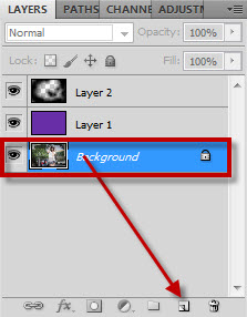 ขั้นตอนต่อมา copy layer Background โดยการคลิกเมาส์ค้างแล้วลากไป ในเครื่องหมายสี่เหลี่ยม ข้างเครื่องหมาย รูปถังขยะ ตามทิศทางลูกศรสีแดงเลย