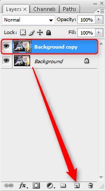 ขั้นตอนที่ 2 คือการ copy layer โดยการ คลิ๊กค้างที่ layer รูป แล้วลากลงไปที่ไอคอนรูปสี่เหลี่ยม ตามลูกศรสีแดง จะเกิด layer copy ขึ้นมา