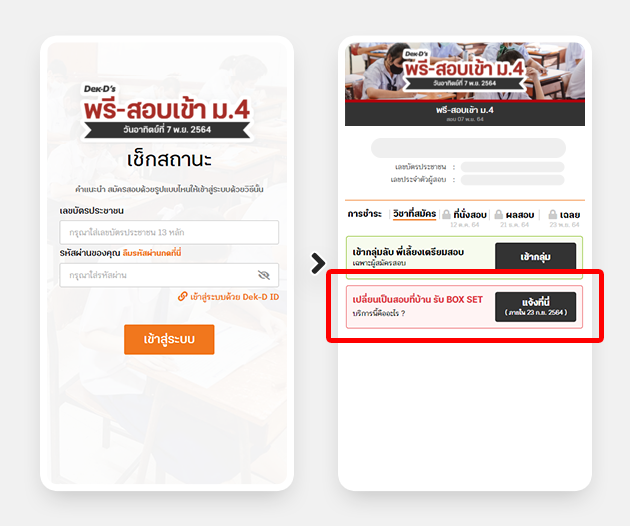 Login เข้าไปกด "เปลี่ยนเป็นสอบที่บ้าน รับ BOX SET"