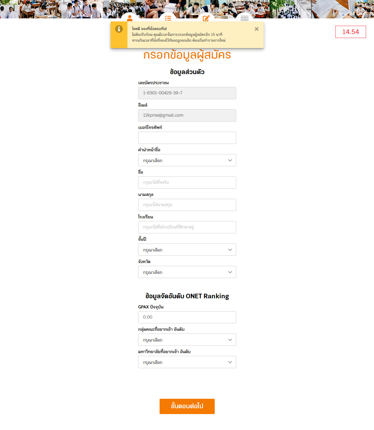 กรอกรายละเอียดส่วนตัวเพื่อสมัครสอบให้ครบถ้วน ภายในเวลาที่กำหนด(15นาที) เพื่อรักษาสิทธิ์การจองที่นั่งของผู้สมัคร กรุณาตรวจสอบความถูกต้องอีกครั้ง ก่อนยืนยันข้อมูล
