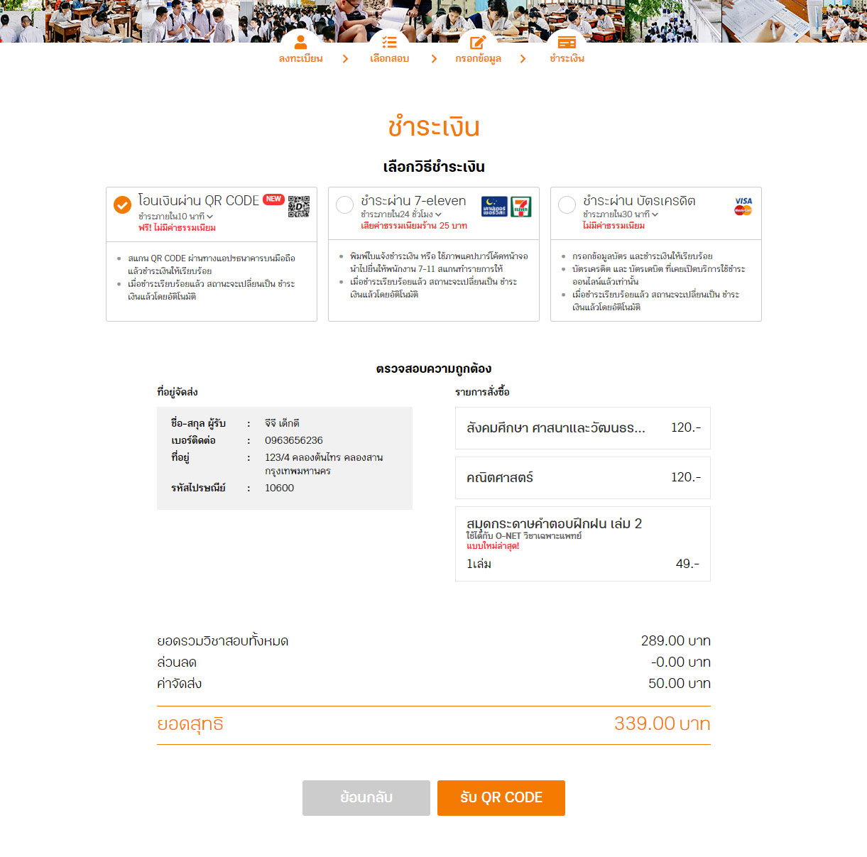 เลือกวิธีชำระเงินในการสมัครสอบ