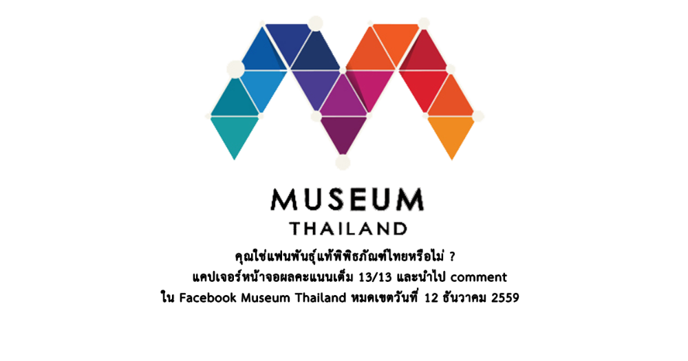 คุณใช่แฟนพันธุ์แท้พิพิธภัณฑ์ไทยหรือไม่ ? แคปเจอร์หน้าจอผลคะแนนเต็ม 13/13 และนำไป comment ใน Facebook Museum Thailand หมดเขตวันที่ 12 ธันวาคม 2559