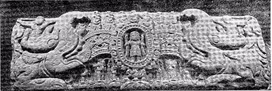 ทับหลังชิ้นหนึ่งมีลักษณะ เป็นมกรหันหน้าเข้ามีคนขี่คายวงโค้งออกมา 2 วง มีเหรียญอยู่ตรงกลาง 1วง ดังภาพทับหลังนี้อยู่ในศิลปะแบบใน