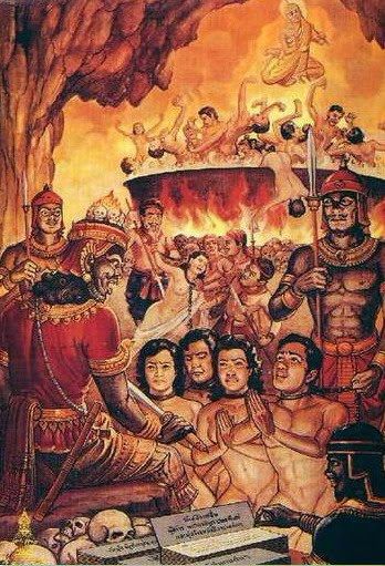 เเล้วฝูงยมบาลเอาเหล็กเเดงอันลุกเป็นไฟใส่กระหวัดรัดตัวเขา เเล้วตระบิดให้คอเขาขาดออก เเล้วเอาหัวเขาทอดลงในหม้อเหล็กเเดงนั้น บัดเดี๋ยวก็บังเกิดหัวอันหนึ่งขึ้นมาเเทนเล่า
