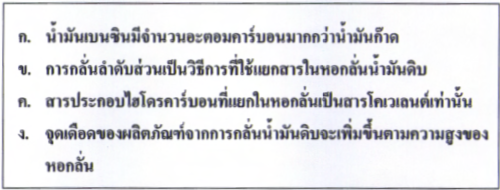 น้ำมันดิบที่ได้จากการขุดเจาะ จะผ่านกระบวนการแยกสารเจือปนต่างๆ แล้วจึงนำส่วนที่เหลือไปแยกต่อในหอกลั่น...พิจารณาข้อความในภาพว่า ข้อความใดถูกต้อง