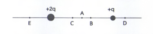 จุด A เป็นจุดกึ่งกลางระหว่างประจุ +2q กับ +q ดังภาพ....จุดใดเป็นจุดสะเทิน (สนามไฟฟ้าเป็นศูนย์)