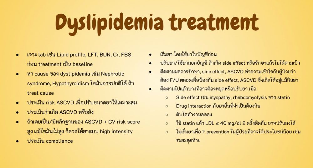 ชาย 62 ปี เป็น CKD 4 มาตรวจ LDL ได้ 120 การรักษาต่อไปนี้ถูกต้อง ยกเว้นข้อใด