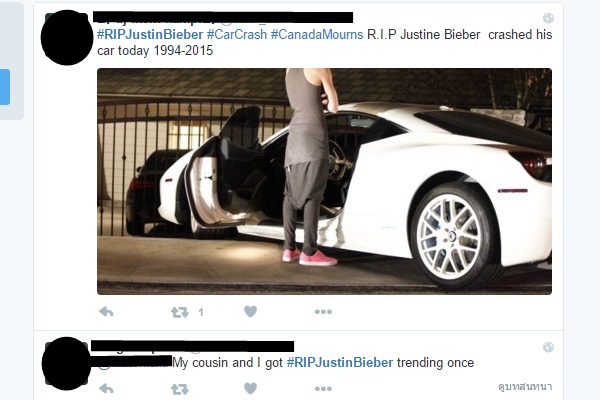 เงิบกันไปทั้งโลกเลยค่ะ เมื่ออยู่ดีๆ ก็มีแอคเคาท์นึงในทวิตเตอร์อัพว่า R.I.P Justin Bieber พร้อมบรรยายว่าบีเบอร์ขับรถเฟอร์รารี่ประสบอุบัติเหตุเสียชีวิต ทำเอาชาวทวิตเตอร์แตกตื่นกันทั้งโลก ร่วมไว้อาลัยติดแฮชแท็ก #ripjustinbieber กันใหญ่ แฟนคลับครึ่งโลกถึงขั้นใจสลาย น้ำตาไหลเป็นสายเลือด แต่ก็ใจเย็นๆ กันก่อนนะคะ เพราะจัสตินยังอยู่ดี ชีวิตแฮปปี้มีความสุขเฟร่อ