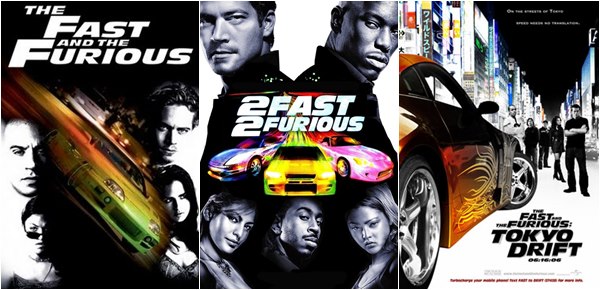 ภาพจากซ้ายไปขวา The Fast and the Furious (ปี 2001), Fast 2 Furious (ปี 2003),