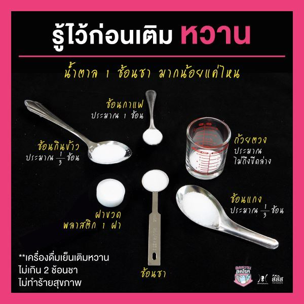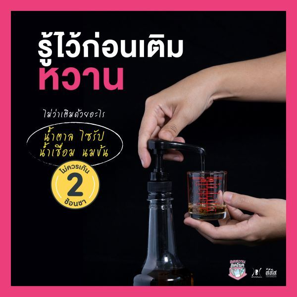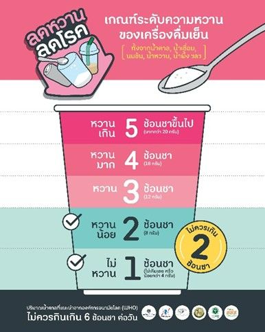 สสส. และ ภาคีเครือข่าย จึงชวนลดการรับปริมาณน้ำตาลในเครื่องดื่ม ด้วยการแนะนำเกณฑ์ระดับความหวานใหม่สำหรับเครื่องดื่มเย็น ทุกครั้งที่สั่งไม่ควรเกินระดับ 2 ไม่เกิน 2 ช้อนชา รวมถึง ไซรัป