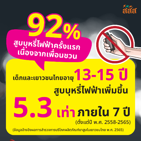 การใช้บุหรี่ไฟฟ้าพบข้อมูลว่า ประชากรช่วง 15-24 ปีกว่า 38% เข้าถึงและมีโอกาสสูบบุหรี่ไฟฟ้า และพบเยาวชนในสังคมไทยเข้าสู่บุหรี่ไฟฟ้าด้วยอัตราการเติบโตสูงถึง 5.3 เท่าในช่วงระยะเวลา 7 ปี