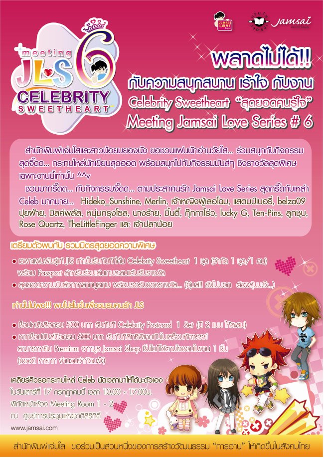 น้องๆ ชาว Dek-D.com คนไหนที่รู้ตัวว่าเป็นแฟนผลงานแนว Jamsai Love Series ของสำนักพิมพ์แจ่มใสล่ะก็ เตรียมตัวกันให้พร้อมนะจ๊ะ เพราะวันเสาร์ที่ 17 ก.ค.นี้ จะมีการรวมพลแฟนนักอ่านวัยใสที่งาน Celebrity Sweetheart สุดยอดคนรู้ใจ ตั้งแต่เวลา 10.00 17.00 น. ที่หน้าห้อง Meeting Room 1-2 ณ ศูนย์การประชุมแห่งชาติสิริกิติ์ งาน Meeting ครั้งนี้สนุกสนานแน่นอน เพราะนอกจากจะได้พบปะพูดคุย ขอลายเซ็นนักเขียนคนโปรดแล้ว ยังมีเกมสนุกๆ มาให้น้องๆ ชาว Dek-D.com เล่นชิงของรางวัลอีกมากมายด้วย ใครไม่ไปล่ะก็ พี่ปัดขอบอกว่าเสียใจแน่จ้ะ ข้อมูลอ้างอิง : สำนักพิมฑืแจ่มใส |