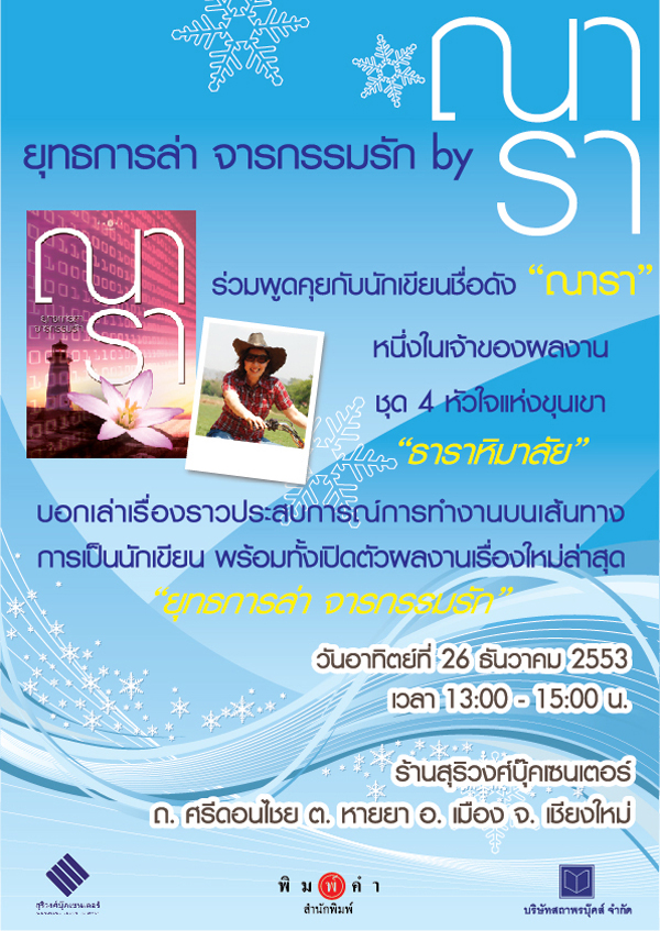 น้องๆ ชาว Dek-D.com ที่เป็นแฟนละคร “ธาราหิมาลัย” รีบเข้ามาทางนี้โดยด่วนเลยจ้ะ เพราะโอกาสที่จะได้พบปะพูดคุยและใกล้ชิคกับ “ณารา” นักเขียนเจ้าของผลงานประพันธ์เรื่องนี้มาถึงแล้วจ้ะ กับงาน “ยุทธการล่า จารกรรมรัก by ณารา” ที่จะจัดขึ้นในวันอาทิตยืที่ 26 ธันวาคม 2553 เวลา 13.00 – 15.00 . ณ ร้านสุริวงศ์บุ๊คเซนเตอร์ ถ.ศรีดอนไชย ต.หายยา อ.เมือง จ.เชียงใหม่