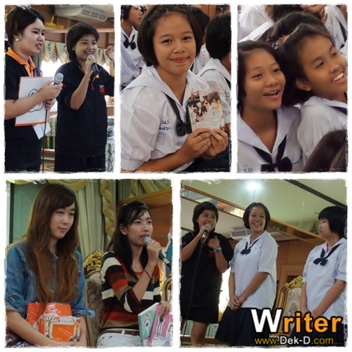 เมื่อวันอังคารที่ผ่านมา (9 ส.ค.) พี่ปัด, พี่เป้, พี่ไม้ไผ่ และพี่แบงค์ พร้อมพี่ๆ ทีมงานสำนักพิมพ์แจ่มใสก็ได้บุกไปมอบรอยยิ้ม ความสนุกสนาน และความรู้เรื่องหลักภาษาไทยกันที่ โรงเรียนสตรีนนทบุรี ซึ่งถือว่าเป็นโรงเรียนสุดท้ายของ นักเขียนหน้าใส Road Show กิจกรรมดีๆ จากโครงการนักเขียนหน้าใส ปี 4 Present By เว็บไซต์เด็กดีดอทคอม และสำนักพิมพ์แจ่มใส แล้วจ้ะ ฟังเคล็ดลับจากรุ่นพี่นักเขียนหน้าใส ก็มีสิทธิ์ได้รับรางวัลติดไม้ติดมือกลับบ้านไปแบบนี้ เริ่มต้นกิจกรรมด้วยการเล่นเกมตอบคำถามจากพี่ๆ ทีมงานสำนักพิมพ์แจ่มใส ต่อด้วยการเชิญ นางร้าย และ Lady First 2 นักเขียนเจ้าของรางวัลชนะเลิศ ประเภท Jamsai Love Series จากการประกวดนักเขียนหน้าใสปี 2 และ ปี 3 พร้อมด้วย พี่ตาล กองบรรณาธิการ ขึ้นเวทีมาพูดคุยถึงประสบการณ์ที่ได้รับจากการประกวด และวิธีการคัดเลือกผลงาน ตื่นเต้น ลุ้น ดีใจ มีครบทุกรสจริงๆ หลังจากนั้น พี่เป้ คอลัมน์นิสต์สาวสุดเก่งจากเว็บไซต์เด็กดีดอทคอมก็ขอคว้าไมค์ขึ้นเวทีมาเชิญชวนน้องๆ โรงเรียนสตรีนนทบุรี สมัครและส่งผลงานเข้าร่วมประกวดนักเขียนหน้าใส ปี 4 ต่อด้วยการเล่นเกมตอบคำถาม ซึ่งน้องๆ โรงเรียนนี้ก็โชว์ความเก่ง และเซียนเรื่องหลักภาษาไทยให้พวกพี่ๆ ได้เห็น ก่อนที่จะปิดท้ายกันที่เกมที่ต้องอาศัยเรื่องดวง และความแม่นยำเรื่องตัวเลขเข้ามาช่วยเท่านั้น จึงจะทำให้ชนะได้ แต่ก็ไม่ใช่เรื่องที่ยากเกินความสามารถของน้องๆ โรงเรียนสตรีนนทบุรีเลยจ้ะ ทำให้ของรางวัลที่พวกพี่ๆ ทีมงานเว็บไซต์เด็กดีดอทคอมเตรียมไปนั้นหมดเกลี้ยงภายในพริบตา น้องๆ โรงเรียนสตรีนนทบุรี น่ารัก ยิ้มแย้ม สมกับเป็นเด็กดีจริงๆ จ้ะ สำหรับกิจกรรม นักเขียนหน้าใส Road Show ในครั้งนี้ พี่ปัดขอบอกว่าประทับใจความน่ารัก สดใส ร่าเริง ของน้องๆ ทั้ง 13 โรงเรียนเลยจ้ะ แถมปีนี้ยังได้มีโอกาสไปมอบความสนุกสนาน รอยยิ้ม และความรู้เรื่องหลักภาษาไทยให้น้องๆ โรงเรียนต่างจังหวัดอีกด้วย ส่วนโรงเรียนไหนที่ นักเขียนหน้าใส Road Show ไม่ได้ไปเยือนก็อย่าพึ่งน้อยใจไปนะจ๊ะ ไว้ปีหน้ามีกิจกรรมใหม่ รับรองว่าพี่ปัดไปบุก!! โรงเรียนของน้องๆ แน่นอนจ้ะ ป.ล. ผู้ที่สนใจเข้าร่วมโครงการประกวดนักเขียนหน้าใส ปี 4 สามารถเข้าไปดูรายละเอียดได้ ที่นี่ เลยจ้ะ ภาพบรรยากาศนักเขียนหน้าใส Road Show ในโรงเรียนที่ผ่านมา โรงเรียนเตรียมอุดมศึกษาพัฒนาการ โรงเรียนสายปัญญา ในพระบรมราชินูปถัมภ์ โรงเรียนสาธิตมหาวิทยาลัยศรีนครินทร์วิโรฒ ปทุมวัน
