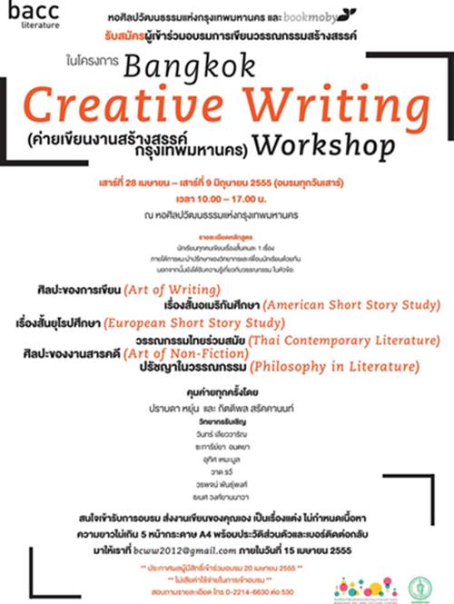มีกิจกรรมดีๆ เพื่อคนมีฝันอยากเป็น “นักเขียน” เกิดขึ้นอีกแล้วจ้ะ น้องๆ ชาว Dek-D.com เมื่อหอศิลปวัฒนธรรมแห่งกรุงเทพมหานคร และ bookmoby ได้เปิดรับสมัครผู้เข้าร่วมอบรมการเขียนวรรณกรรมสร้างสรรค์ในโครงการ Bangkok Creative Writing Workshop (ค่ายเขียนงานสร้างสรรค์กรุงเทพมหานคร) งานนี้ขอบอกว่าฟรี!! ไม่เสียค่าใช้จ่ายในการเข้าอบรม