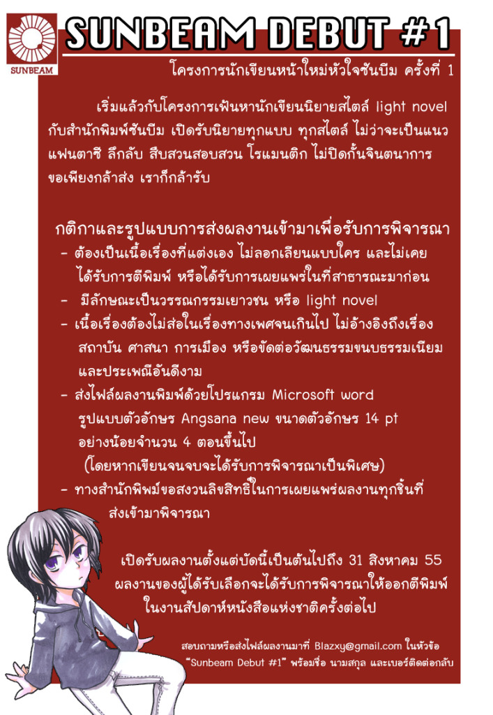 ส่งผลงาน : ส่งไฟล์ผลงานมาที่ Blazxy@gmail.com ในหัวข้อ Sunbeam Debut # 1 พร้อมชื่อ-นามสกุล และเบอร์ติดต่อกลับ