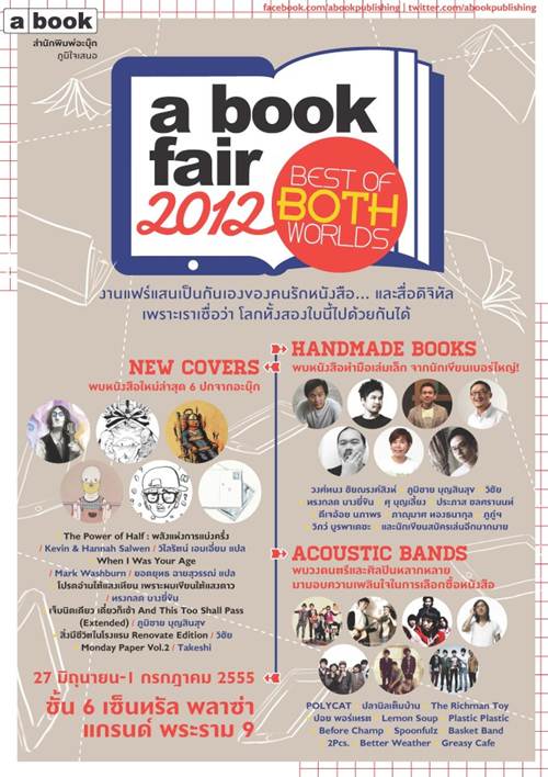 น้องๆ ชาว Dek-D.com เตรียมพบกับ “a book fair 2012” งานของคนรักหนังสือและสื่อดิจิทัล ที่ปีนี้มามาภายใต้คอนเซ็ปต์สุดเก๋ “Best of Both Worlds : เก่าเจอใหม่” โดยงานจะจัดระหว่างวันที่ 27 มิ.ย. - 1 ก.ค. 2555 ณ เซ็นทรัล พลาซ่า แกรนด์ พระราม 9