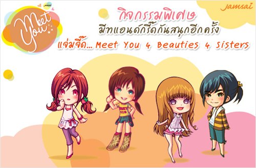 สวัสดีจ้ะ น้องๆ ชาว Dek-D.com วันนี้พี่ปัดมีกิจกรรมดีๆ มาฝากอีกแล้วจ้ะ โดยครั้งนี้จะชวนทุกคนไปสัมผัสกับความสุข ความสนุก และความประทับใจ กับการได้ใกล้ชิดนักเขียนคนโปรดในกิจกรรมที่มีชื่อเก๋ๆ ว่า “แจ่มจี๊ด... Meet You : 4 Beauties 4 Sisters”