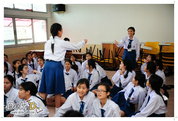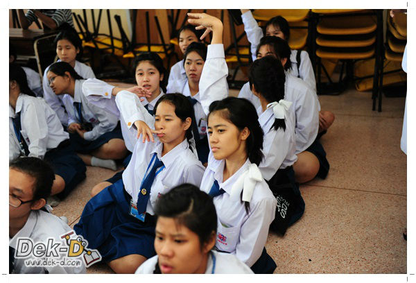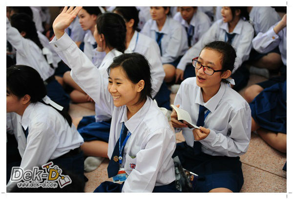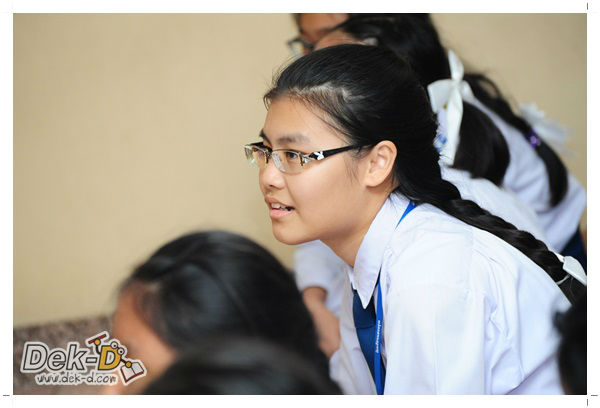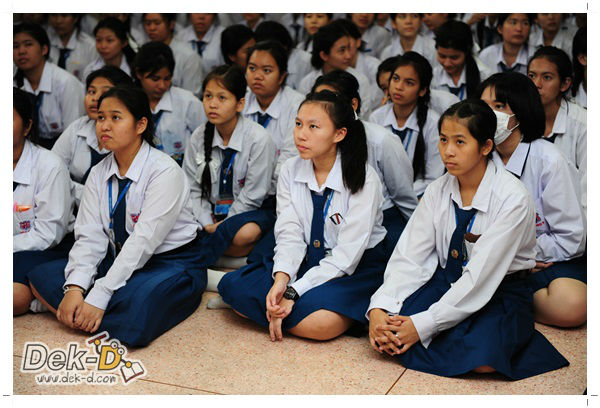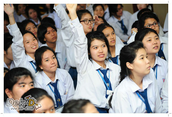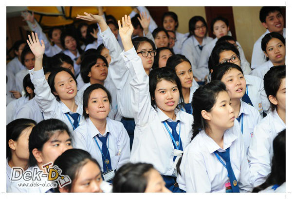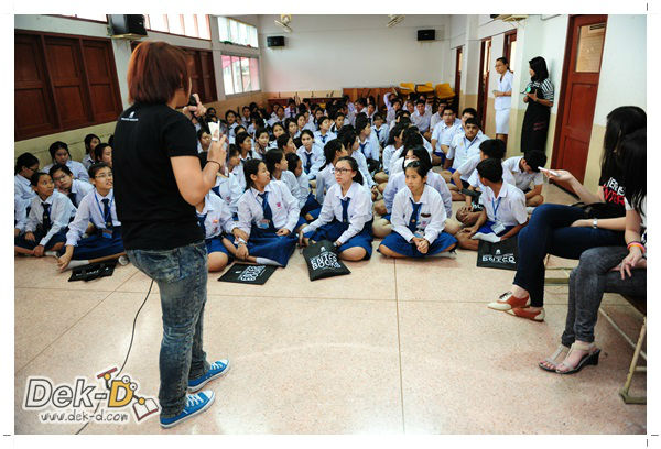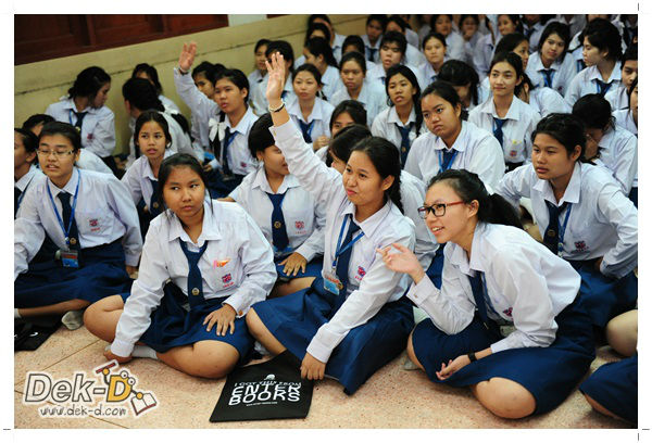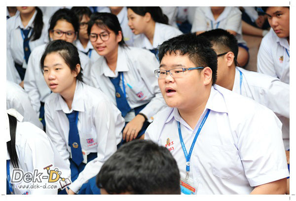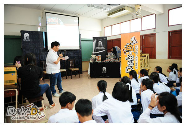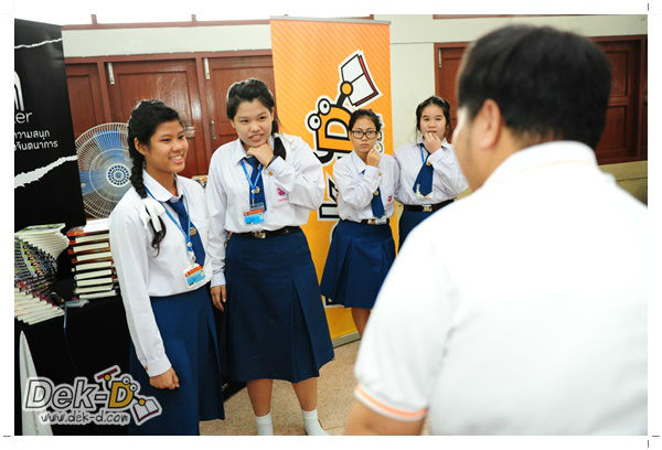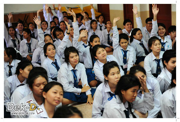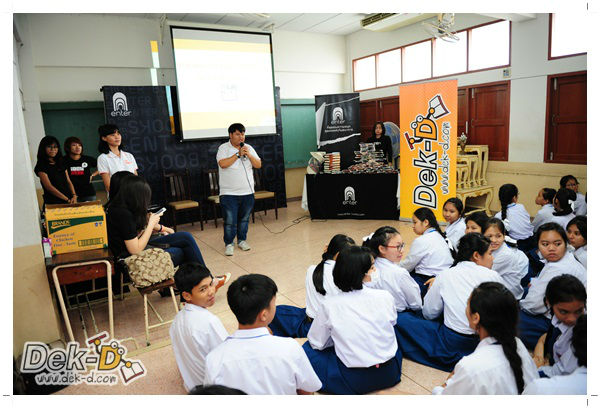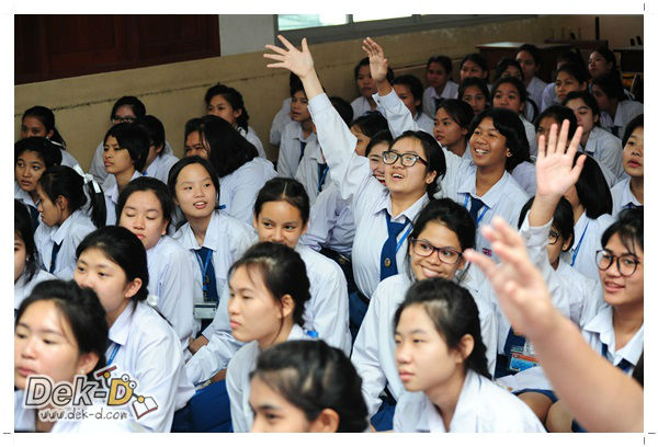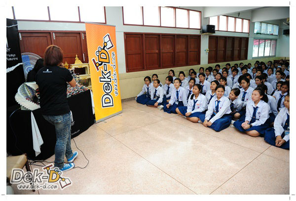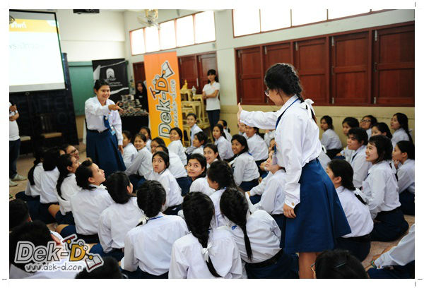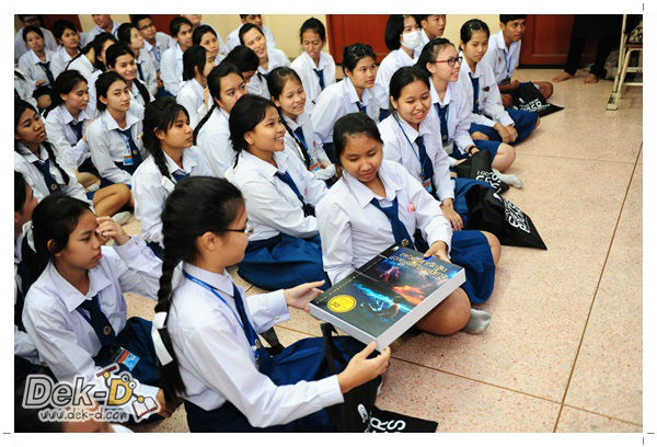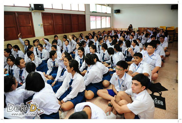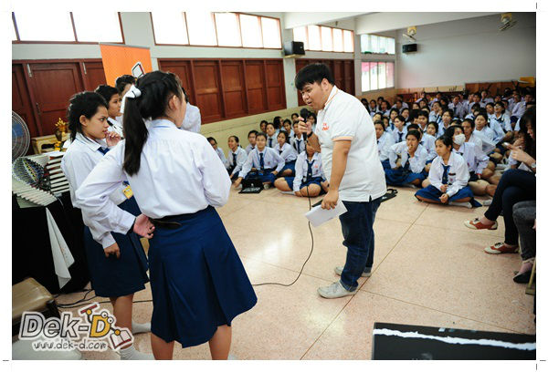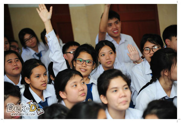 เราใช้เวลาเดินทางกันไม่นานจากออฟฟิซ Dek-D เพราะอยู่ใกล้ๆ กัน บรรยากาศของโรงเรียนดูร่มรื่น น่าเรียน น้องๆ ที่เข้าฟังเป็นน้องๆ จากชั้นม.ปลาย เกือบร้อยชีวิต ที่เป็นผู้ได้รับการคัดสรรให้มาร่วมงาน (และลุ้นรับของรางวัล) กันในวันนี้ พูดเลยว่างานนี้สนุกมากจริงๆ