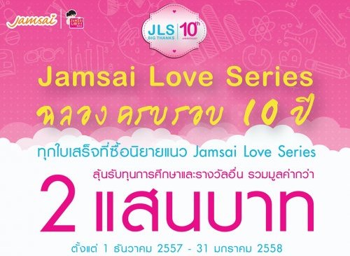 สำนักพิมพ์แจ่มใส จัดแคมเปญ JLS Big Thanks แทนคำขอบคุณให้กับแฟนนักอ่านลุ้นชิงทุนการศึกษาและของรางวัลต่างๆ รวมมูลค่ากว่า 2 แสนบาท ร่วมสนุกได้ง่ายๆ เพียงซื้อนิยายแนว JLS เล่มใดก็ได้ จากร้านหนังสือที่ร่วมรายการ หรือผ่านทางเว็บไซต์ www.jamsai.com  แล้วส่ง SMS มาที่หมายเลข 4712277 โดยพิมพ์ JLS ตามด้วย#ร้านที่ซื้อ#สาขาที่ซื้อ# เลขที่ใบเสร็จ#ชื่อลูกค้า เริ่มตั้งแต่วันนี้ไปจนถึงวันที่ 31 มกราคม 2558 นี้ รายละเอียดเพิ่มเติมติดตามได้ที่เว็บไซต์สำนักพิมพ์หรือโทร 02-840-4800