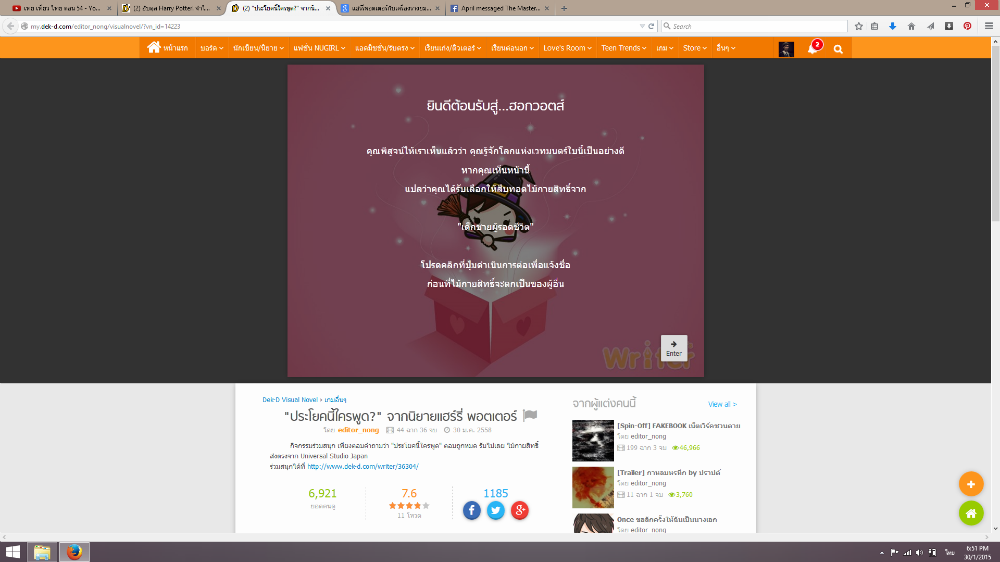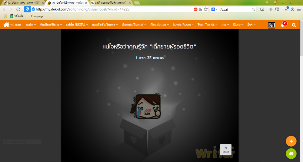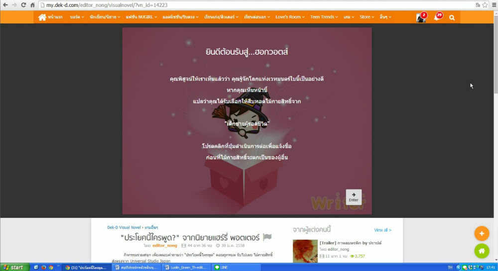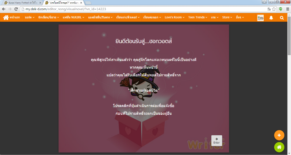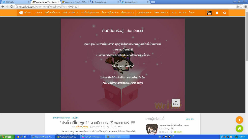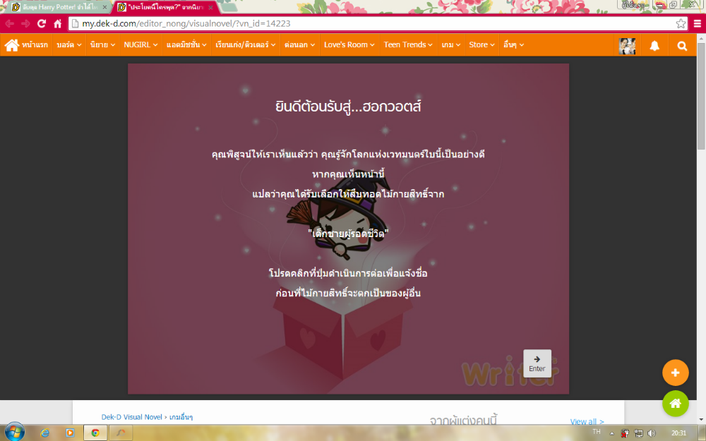 บอกไว้ก่อนว่าพี่น้องใช้ฟังก์ชั่นตอบคำถามของ Visual Novel แปลว่าเราต้องพิมพ์คำตอบเอง ไม่มีตัวเลือก และต้องพิมพ์ให้ถูกตามแบบนิยาย โดยที่ชื่อตัวละครนั้นขอให้เขียนแค่ชื่อเพียงอย่างเดียว เช่น แฮร์รี่ พอตเตอร์ ก็เขียนว่า แฮร์รี่ ถ้าคำตอบคือศาสตราจารย์ดัมเบิลดอร์ ก็เขียนแค่ ดัมเบิลดอร์ ถ้าพิมพ์ชื่อไม่ถูกอาจจะลองนามสกุล ถ้านามสกุลไม่ถูก ก็พิมพ์ชื่อ (เอาอันที่มีคนเรียกบ่อยที่สุด)