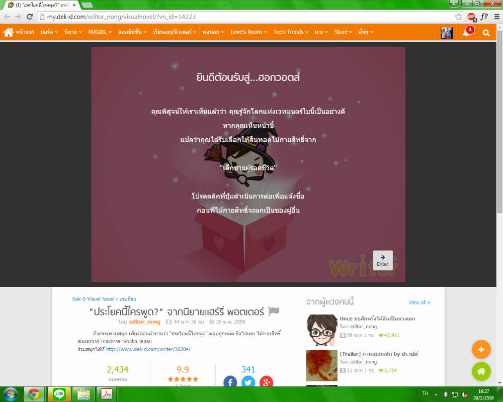 บอกไว้ก่อนว่าพี่น้องใช้ฟังก์ชั่นตอบคำถามของ Visual Novel แปลว่าเราต้องพิมพ์คำตอบเอง ไม่มีตัวเลือก และต้องพิมพ์ให้ถูกตามแบบนิยาย โดยที่ชื่อตัวละครนั้นขอให้เขียนแค่ชื่อเพียงอย่างเดียว เช่น แฮร์รี่ พอตเตอร์ ก็เขียนว่า แฮร์รี่ ถ้าคำตอบคือศาสตราจารย์ดัมเบิลดอร์ ก็เขียนแค่ ดัมเบิลดอร์ ถ้าพิมพ์ชื่อไม่ถูกอาจจะลองนามสกุล ถ้านามสกุลไม่ถูก ก็พิมพ์ชื่อ (เอาอันที่มีคนเรียกบ่อยที่สุด)