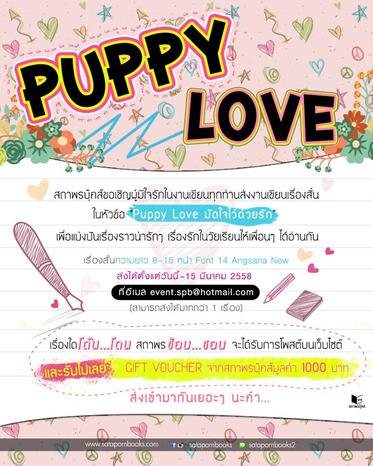Puppy Love มันก็บอกได้กลาย ๆ นะว่าแบบ รักใส ๆ วัยเด็ก สมหวังคงยาก แต่แบบแต่งไม่ออก เขียนไม่ได้ เจอหัวข้อนี้ วีรกรรมสมัยหัดมีรักแรกแบบเข้ามาเป็นฉาก ๆ เลยอ่ะ ฮื่ออออออ