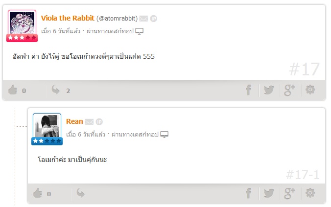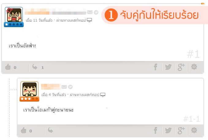 - ในขณะเดียวกัน หาคู่ให้ตัวเองไปด้วย เช่น เราอยากเป็นโอเมก้า ไล่หาดูก่อนว่ามีคนประกาศเป็นอัลฟ่าแล้วยังไม่มีคู่หรือเปล่า ถ้ามีก็ไปโพสต์ต่อท้ายเขา ถือว่าการจับคู่เสร็จสมบูรณ์ แต่ถ้าไม่มี เราก็โพสต์คอมเมนต์ใหม่ แล้วรอคนอื่นมาจับคู่กับเราแทน (คนที่จับคู่แล้วดันตรงกับอีกคนที่โพสต์เวลาเดียวกัน อนุญาตให้คนมาทีหลังลบคอมเมนต์ตัวเองแล้วไปจับคู่ใหม่ได้)