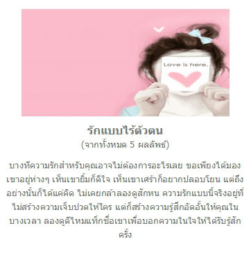 ไม่น่าเชื่อว่าจะมีความรักแบบนี้อยู่ในโลกใช่ไหม แต่เชื่อเถอะว่ามี และคนคนนั้นก็ต้องเป็นคนอย่างคุณนี่แหละ ความรักที่ไม่หวังการตอบแทน แค่ได้เห็นคนที่รักมีความสุขก็เพียงพอ ฟังดูอาจน้ำเน่า แต่รับรองว่าใครที่ได้คบกับคุณจะกลายเป็นคนที่โชคดีที่สุดในโลกในเรื่องของความรัก ไม่เชื่อบอกเขาให้โอกาสคุณได้ลองดู