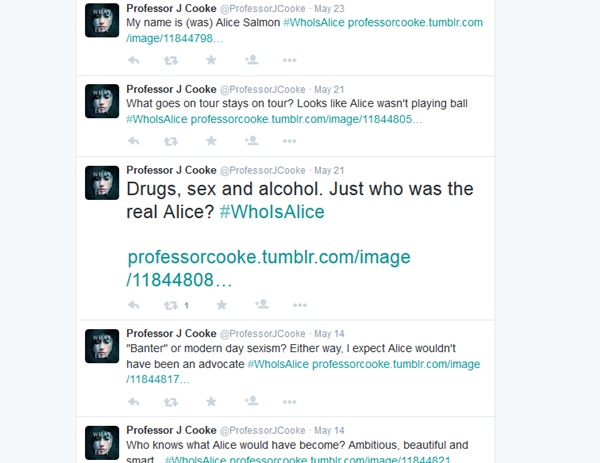 นิยายของทิมใช้ชื่อว่า What She Left (อะไรที่เธอทิ้งไว้) นามปากกา T.R. Richmond ดำเนินเรื่องผ่านมุมมองของศาสตราจารย์คุก ผู้เชี่ยวชาญด้านมานุษยวิทยาที่ต้องการค้นหาความจริงเกี่ยวกับการตายของอลิซ แซลมอนอดีตลูกศิษย์วัยยี่สิบปี เบาะแสเพียงหนึ่งเดียวของเขาเริ่มจากสิ่งที่เธอทิ้งไว้ในทวิตเตอร์ ตัวนิยายจะดำเนินเรื่องโดยใช้ข้อมูลจากทวิตเตอร์ เฟซบุ๊ก ข้อความต่างๆ ที่ผู้ตายโพสต์ทิ้งไว้ตามบอร์ดสาธารณะ รวมไปถึงบันทึกประจำวันของเธอด้วย