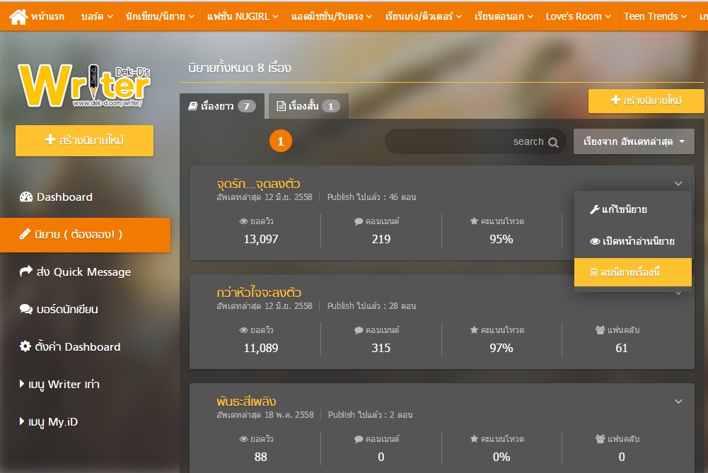 คลิกเมนูด้านขวามือ เลือกคำว่า "ลบนิยายเรื่องนี้"