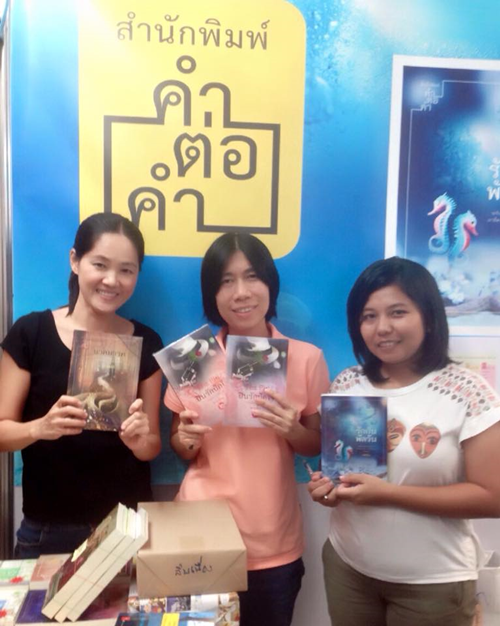 ยังค่ะยังไม่หมดของมาต่ออีกนิดที่ สำนักพิมพ์ คำต่อคำ ไม่คำว่าผิดหวัง มีขายนิยายที่ไหน ผลงานเด็กดีก็มีวางจำหน่ายอยู่ที่นั่นแหละ สำหรับบูธนี้มาเรื่อยๆ ขายเรื่อยๆ แต่จะฮ้อตมากเป็นพิเศษเวลาที่มีนักเขียนเด็กดีมาแจกลายเซ็น ที่เห็นๆ มายืนแจกกันตัวเป็นๆ ก็นี่เลยค่ะ นักเขียนที่พี่อรเพิ่งจะสัมภาษณ์ลงในคอลัมน์พบปะพูดคุยไป คุณจิ้ง หรือ อยุทธ์ เจ้าของผลงาน "แสนรัก"