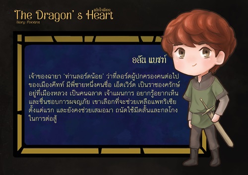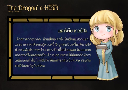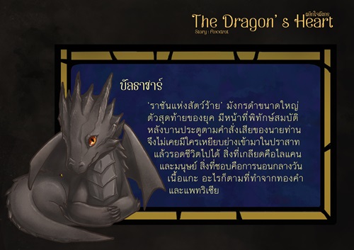 เราคิดว่าจะแต่งนิยายให้สนุกได้ เราต้องสนุกกับการแต่งมันขึ้นมาก่อน การที่ในนิยายมีแต่สิ่งที่ชอบน่าจะทำให้เราสนุกกับมันได้ไม่ยาก The Dragon's Heart จึงมีเกือบทุกอย่างที่เราชอบ ตั้งแต่มังกรตัวโตแต่นิสัยอ่อนโยน ปราสาทร้างที่เต็มไปด้วยปริศนา แม่มดเจ้าเล่ห์ที่มีรอยยิ้มน่าสงสัย และมาสคอตป่วนๆ ที่คอยสร้างเสียงหัวเราะเป็นระยะๆ เพราะฉะนั้นเราจึงหวังว่าทุกท่านจะชอบนิยายเรื่องนี้เหมือนที่เราชอบค่ะ”