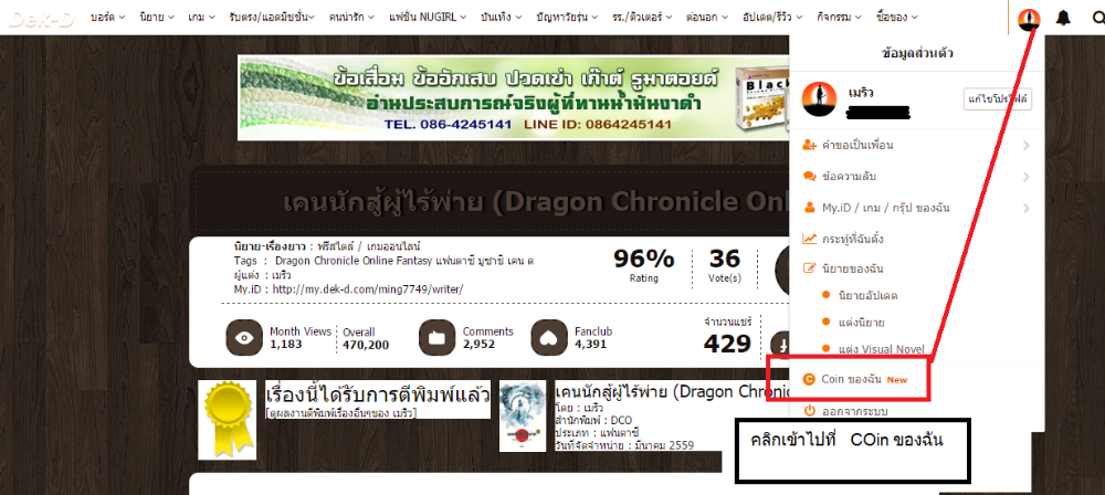 1. เติมเงินง่ายๆ โดยกดเข้าไปที่รูป myid ของตนเองในหน้าเว็บเด็กดี ที่อยู่มุมขวาบน จากนั้นจะเกิดหัวข้อรายละเอียดของตนเองขึ้นมา เราก็กดเข้าไปที่ Coin ของฉัน