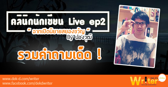 สวัสดีค่ะชาวเด็กดีไรเตอร์ทุกคน ผ่านไปแล้วกับกิจกรรม ''คลินิกนักเขีน Live ถามสด ตอบสด'' ตอน ฉากเปิดนิยายสยองขวัญ โดยรุ่นพี่นักเขียนเด็กดี ปองวุฒิ ที่คราวนี้มาพบกันในรูปแบบ Live ผ่านเฟซบุ๊กนักเขียนเด็กดี : Dek-D Writer กันแบบสดๆ ให้เพื่อนๆได้เข้ามาชมกันอย่างเต็มอิ่มทั้งภาพและเสียง มาพร้อมความรู้และเทคนิคการเขียนฉากเปิดของนิยายสยองขวัญแบบเน้นๆ และคำถามสำคัญ คิดว่าอะไรทำให้ปองวุฒิกลายเป็นที่จดจำในฐานะ "เซียนนิยายผี" ซึ่งเขาก็มาเปิดใจกับเราว่า "เพราะว่าเขียนนิยายมาเยอะ และนิยายแต่ละเรื่องล้วนแต่มีองค์ประกอบที่เกี่ยวข้องกับเรื่องลึกลับหรือการหักมุมทั้งนั้น โดยเฉพาะช่วงหลังเขียนนิยายที่เป็นเรื่องผีเยอะและได้รับเสียงตอบรับดี" นี่แค่เริ่มต้นเท่านั้นนะคะ ตลอดทั้งรายการเรียกได้ว่ามีครบทั้งสาระ ความสนุกและแรงบันดาลใจเต็มเปี่ยมตลอดทั้ง 1 ชั่วโมงเลยค่ะ