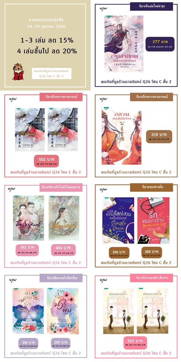 สำนักพิมพ์น้องใหม่เอาใจนักอ่านทุกสาย เตรียมเสิร์ฟนิยายสนุกๆ ให้ทุกคนเเล้วค่ะ จะนิยายวาย นิยายรัก นิยายจีนก็มีครบ อย่างในงานมหกรรมหนังสือครั้งนี้ก็มีนิยายจีนที่เคยติดอันดับในเว็บเด็กดีตีพิมพ์ด้วย