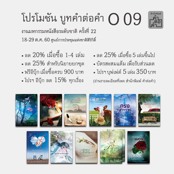 สำนักพิมพ์เเรกที่ขอนำเสนอในวันนี้คือสำนักพิมพ์คำต่อคำ ที่เป็นสำนักพิมพ์สำหรับนักอ่านสายนิยายรักตรึงใจ ในงานนี้มาพร้อมโปรโมชั่นเลิศๆ ทั้งส่วนลด 20-25%* นิยายทุกเรื่องทุกเล่ม ทั้งเก่าและใหม่ / ซื้อยกชุด ลด 25% / โปรฯ บุฟเฟต์ 5 เล่ม 350 บาท ที่สำคัญคือทางบูธยินดีรับบัตรเครดิตเมื่อมียอดชำระเงินตั้งแต่ 1,000 บาทขึ้นไปด้วยค่ะ โดยนิยายเด็กดีที่จะออกในงานในหนังสือนี้ ได้แก่