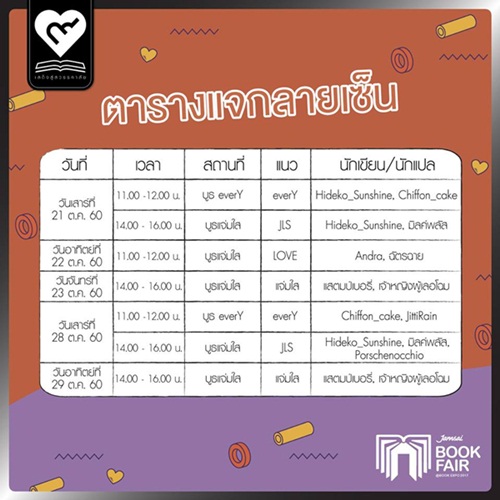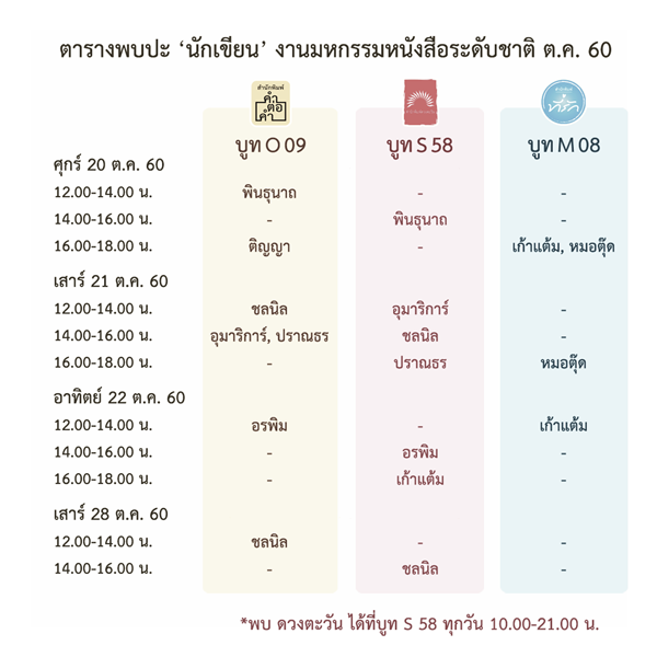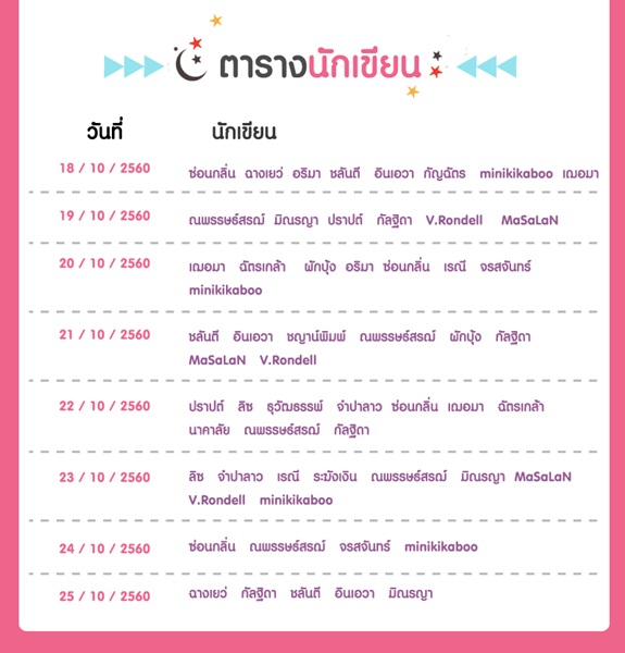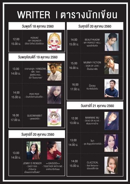 เก็บข้อมูลบูธต่างๆ และตารางหนังสือพร้อมโปรโมชันน่าสนใจกันไว้ครบรึยังคะ เพราะว่าถ้าไม่เตรียมตัวละก็อาจจะไปเดินงกๆ เงิ่นๆ ในงาน ไม่ทันนักอ่านคนอื่นกันได้นะคะ เป็นครั้งเเรกที่พี่หวานได้มารวบรวมรายชื่อหนังสือนิยายของนักเขียนเด็กดี ทำให้รู้เลยว่านิยายดีๆ ในเว็บของเราที่เข้าตาสำนักพิมพ์มีมากมากเลย นี่ยังไม่รวมไปถึงบรรดานิยายทำมือที่นักเขียนคนอื่นๆ ดูเเลจัดการเองอีกด้วย ถ้าตกหล่นเรื่องไหนไปสามารถบอกพี่หวานได้เลยนะคะ ทางทีมไรท์เตอร์พร้อมจะสนับสนุนนักเขียนทุกคนเเละผลงานทุกเรื่องอย่างเเน่นอน ไว้เจอกันในงานหนังสือค่าา ^___^