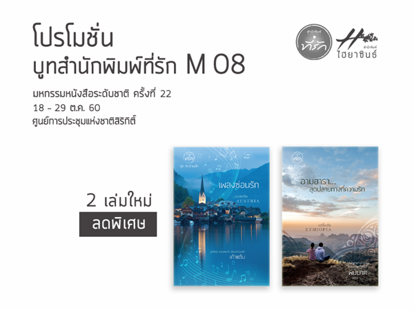 สำหรับพี่หวานตั้งใจว่าจะปักหมุดที่บูธนี้ก่อนเลยค่ะ เพราะนิยายของสำนักพิมพ์ที่รักนั้นเหมาะสำหรับคนที่ชอบเดินทางท่องเที่ยว ใครที่อยากเปิดโลกใหม่เเต่ยังไม่มีเวลาก็มาเที่ยวเก็บประสบการณ์น่าประทับใจผ่านนิยายจากสำนักพิมพ์ที่รักกันก่อนได้ค่ะ ที่สำคัญโปรโมชันก็ไม่แพ้ใคร จัดไปเลยสำหรับใครที่ซื้อหนังสือของที่รักและไฮยาซินธ์ ลด 25% ทั้งเก่าและใหม่ ส่วนนิยายเด็กดีที่ได้วางแผงเป็นเล่ม ได้แก่