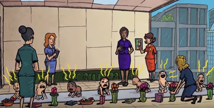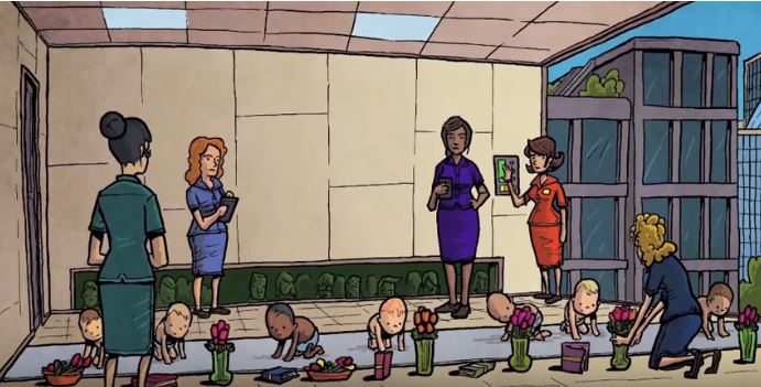 การเลี้ยงดูทารกของนักวิทยาศาสตร์ในโลกนี้ พี่คิดว่ามีลักษณะคล้ายกับการควบคุมสัตว์ของพาฟลอฟ ( Ivan Petrovich Pavlov ) ซึ่งเป็นการใช้จิตวิทยาที่ชื่อว่า “หมาหิว” เพื่อศึกษาพฤติกรรมการเรียนรู้ของสัตว์ ด้วยการสั่นกระดิ่งเพื่อหลอกสุนัขว่าอาหารมาแล้ว หลังการทดลองพบว่า เมื่อสั่นกระดิ่ง แม้จะไม่มีอาหารให้สุนัขจริงๆ ก็ตาม สุนัขจะเกิดอาการน้ำลายไหลและสั่นหางเพื่อรอคอยอาหารเช่นนี้เสมอ ซึ่งพี่คิดว่าการล้างสมองเด็กตั้งแต่เกิดแบบนี้ ในโลกที่ “กล้าเรียกตัวเองว่าเป็นโลกแห่งความสุข” ถือเป็นเบื้องหลังอันเลวร้ายที่ทำให้เราต้องกลับมาคิดทบทวนอีกครั้งว่า จริงๆ แล้ว เรากำลังเพ้อฝันถึงโลกแบบไหนกันแน่