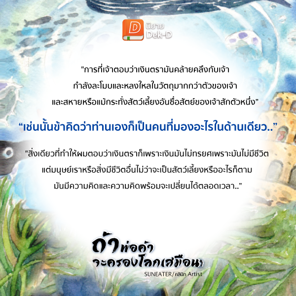 “เงินสำคัญ เพราะมันไม่มีวันทรยศเรา เหมือนสิ่งมีชีวิตอื่นที่สามารถเปลี่ยนความคิดได้ตลอดเวลา” คำพูดนี้ทำให้เราอดไม่ได้ที่จะหันกลับมาลองคิดดูว่า… บางครั้งการที่มีคนตอบว่าสิ่งสำคัญที่สุดของเขาคือ “เงิน” ก็ไม่ได้เปลี่ยนว่าเขาจะเป็นคนเห็นแก่เงิน หรือคนโลภแต่อย่างใด เขาอาจจะมีความคิดเหมือนพระเอกเรื่องนี้ที่คิดว่าอย่างน้อย “เงิน” ก็ไม่มีทางทรยศเขาก็ได้ จริงไหมคะ แถมการที่พระเอกของเราเลือกเป็นพ่อค้า คอยขายของ ทำการค้า ก็กลายเป็นจุดเด่นที่แตกต่างจากผู้เล่นอื่นๆ ที่เลือกอาชีพต่อสู้ หวังทำสงคราม ทำร้ายผู้อื่น อ่านเรื่องนี้แล้ว ทำให้พี่หญิงอดคิดไม่ได้ว่า… อาชีพธรรมดาๆ ที่ถูกมองข้ามอย่างพ่อค้าหน้าเงิน ก็มีดีไม่แพ้อาชีพแกร่งๆ อย่างนักดาบหรือจอมเวทย์ โลกของเราใบนี้ ทุกคนมีความสำคัญเท่าเทียมกัน ทุกๆ อาชีพต่างก็มีจุดเด่นของตัวเอง ไม่มีใครที่ดีกว่าหรือด้อยกว่าใคร ถ้าหากทุกคนสามารถคิดแบบนี้ได้ โลกเราคงจะสงบมากขึ้น ในชีวิตจริงก็เหมือนกันค่ะ เราไม่ควรมองว่าใครแย่กว่าหรือต่ำต้อยกว่า แต่ควรมองทุกคนเท่าเทียมกันและให้เกียรติซึ่งกันและกันด้วยนะคะ