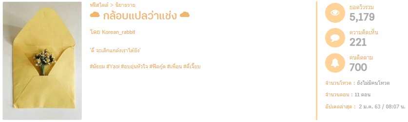Korean_rabbit : สวัสดีค่ะ Korean_rabbit เองนะคะ หลายๆ คนอาจจะคุ้นแล้วหรืออาจจะไม่รู้จักกันมาก่อน ตอนนี้เป็นนักเขียนนิยายแนว Boy love(Yaoi) ค่ะ เพิ่งเริ่มมาเขียนแนวนี้ได้ประมาณปีเดียวเอง มือใหม่เลยค่ะ ที่จริงรวมๆ แล้วปีที่ผ่านมาเขียนไปหลายเรื่องอยู่เหมือนกัน สำหรับนิยายที่หลายๆ คนน่าจะเคยเห็นกันผ่านตาบ่อยๆ ก็มี เปรมจ๋า, เป็นแค่รองประธานอย่าห้าว, ใครชอบจิ้งยกมือขึ้น และพี่จะตีนะเนยค่ะ