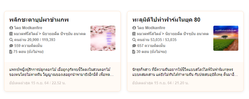 แต่หลังจากที่เธอได้ไปอ่านสัมภาษณ์นักเขียนใน ‘เพจนักเขียนเด็กดี’ แล้วมีคนเล่าว่า แต่งนิยายมีรายได้มากกว่าตอนทำงานประจำ เธอก็ได้ตัดสินใจลองแต่งแล้วอัปลงในเว็บเด็กดีดูบ้าง โดยใช้นามปากกาว่า Modkanfire มาเขียนนิยายเรื่อง ทะลุมิติไปทำฟาร์มในยุค 80 และ พลิกชะตาบุปผาข้ามภพ ขึ้นมา ซึ่งเธอใช้เวลาในช่วง 3 เดือนที่ผ่านมา เขียนไป ขายไป จนมีรายได้จากนิยายที่ยังเขียนไม่จบเทียบเท่ารายได้จากงานประจำที่เคยทำได้จริงๆ