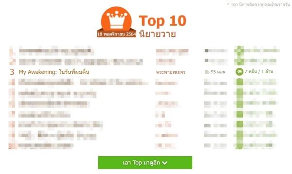 พูดถึงนิยายฮิตติดท็อปที่ Dek-D ในช่วงนี้ โดยเฉพาะอย่างยิ่งกลุ่มนิยายวาย ไม่พูดถึงเรื่อง My Awakening: ในวันที่ผมตื่น ก็คงจะไม่ได้ เพราะเรื่องนี้ยังคงติดท็อปอย่างต่อเนื่อง เรียกได้ว่านักเขียนอัปสม่ำเสมอมากเท่าไหร่ นักอ่านก็พร้อมจะติดตามอ่านอย่างสม่ำเสมอมากเท่านั้น จนปัจจุบันนี้ยอดวิวรวมกว่า 1,300,000 วิวแล้ว!