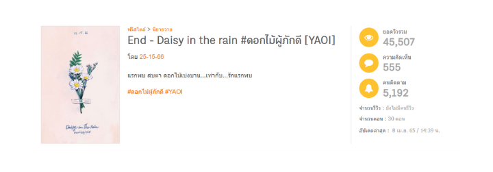 และถ้าให้เลือกนิยายเรื่องไหนที่ความหมายจะเหมือนกับดอกเดซี่ดอกนี้คงหนีไม้พ้นเรื่อง Daisy in the rain #ดอกไม้ผู้ภักดี เพราะว่าการพบเจอของทั้งตัวละครทั้งสองในเรื่องนี้เหมือนกับการเริ่มต้นใหม่ของความรัก เป็นรักแรกพบของกันและกันเลยล่ะ