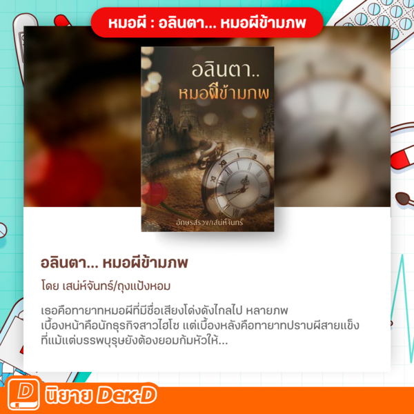 มาถึงหมอสุดท้ายของเรากันแล้ว หมอผีนั่นเอง ! แต่ว่าหมอผีในเรื่องนี้น่ะไม่ธรรมดาน่ะสิ เพราะ ‘อลินตา’ เบื้องหน้าที่ทุกคนมองมาที่เธอ เธอคือ ไฮโซสาวนักเล่นหุ้นที่มีชายหนุ่มหลายคนหมายปองเอาไว้ แต่เบื้องหลังของเธอกลับมีอาชีพเป็น ‘หมอผี’ ที่คอยช่วยเหลือคนจากทุกภพทุกชาติด้วยการข้ามมิติเวลาไปยังยุคต่าง ๆ ไกลถึงยุคล้านนาเลยทีเดียว แต่ก็มีเพียงแค่คนใกล้ชิด และสนิทเท่านั้นที่รู้