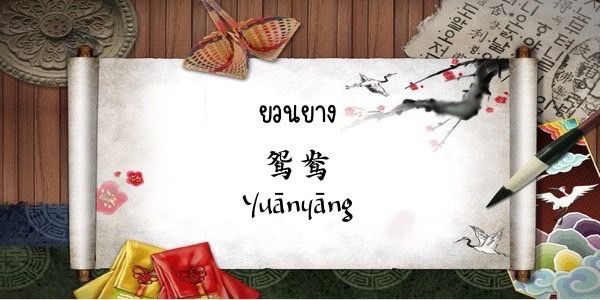 อ่านเลยความหมายของสำนวนนี้: รักที่มั่นคงไม่แปลผัน สำนวนนี้จะมีการเปรียบเปรยความรักที่ซื่อสัตย์มั่นคงกับยวนยาง หรือ นกเป็ดน้ำแมนดารินที่เป็นสัญญาลักษณ์ของการรักเดียวใจเดียว ด้วยมีความเชื่อว่า นกเป็ดน้ำแมนดาริน เป็นนกที่รักเดียวใจเดียว มีคู่เดียวตลอดชีวิต คนจีนจึงมักใช้คำนี้ในพิธีการแต่งงานเพื่ออวยพรบ่าวสาว นั้นเอง