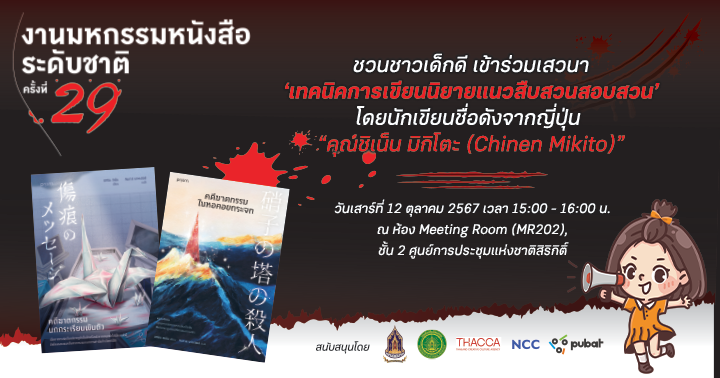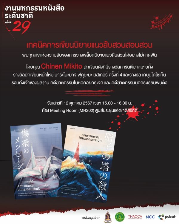 ในกิจกรรมเสวนา ‘เทคนิคการเขียนนิยายแนวสืบสวนสอบสวน’ เป็นกิจกรรมที่จะต่อยอดให้กับเหล่านักเขียนและนักอยากเขียน ได้ค้นหามุมมองแห่งความลึกลับของตัวเอง พบแนวทางการวางโครงเรื่องให้พลิกผันได้อย่างคาดไม่ถึง โดยนักเขียนชื่อดังจากญี่ปุ่น “คุณชิเน็น มิกิโตะ (Chinen Mikito)” เจ้าของรางวัลนักเขียนหน้าใหม่ บาระโนะมาจิ ฟุกุยะมะ มิสเทอรี่ ครั้งที่ 4 และรางวัล เคบุนโดโชเท็น และยังมีผลงานเขียนยอดนิยมอย่างคดีฆาตกรรมในหอคอยกระจก และคดีฆาตกรรมนกกระเรียนพันตัว